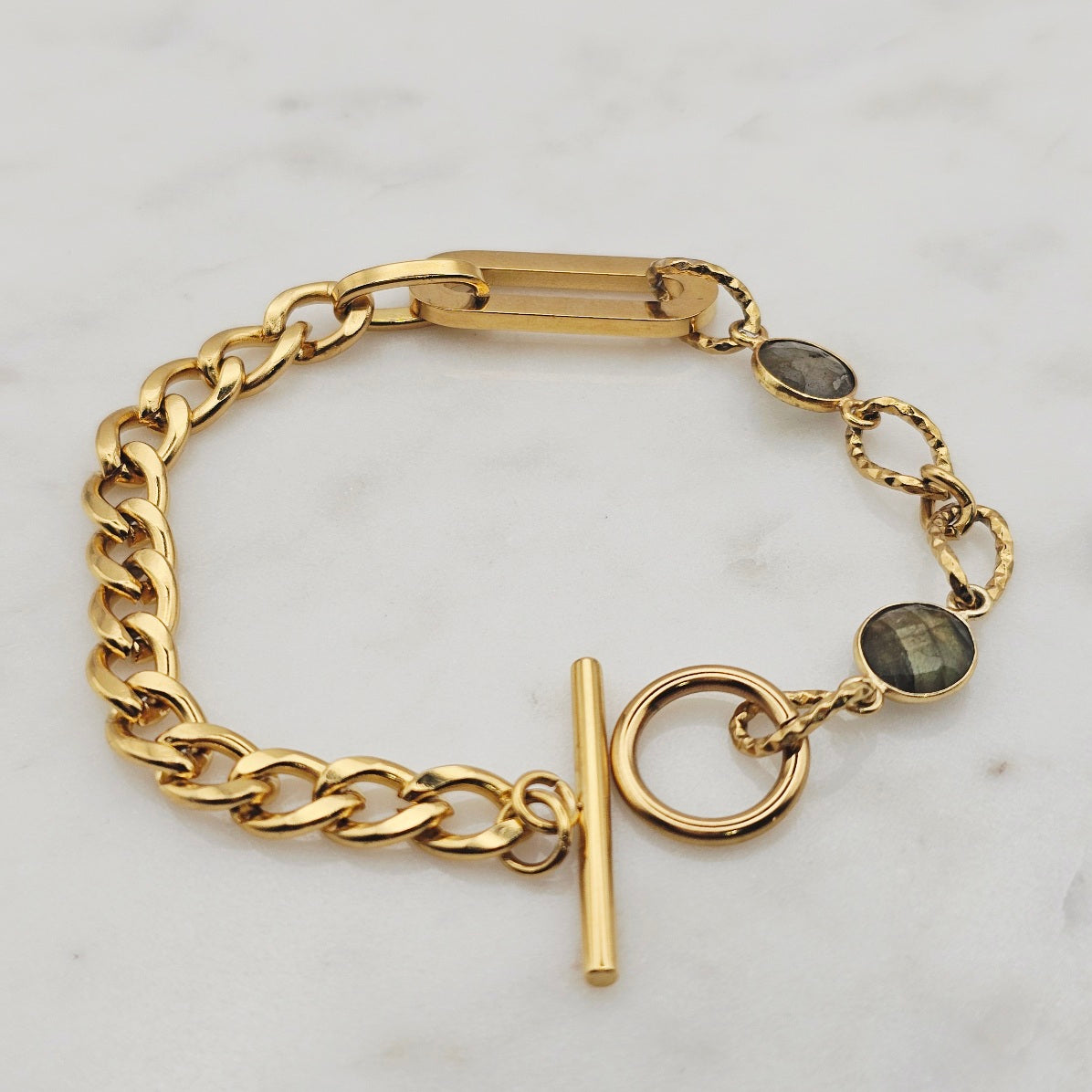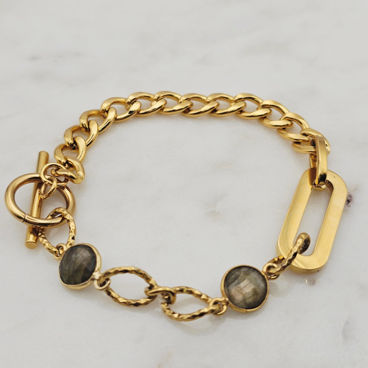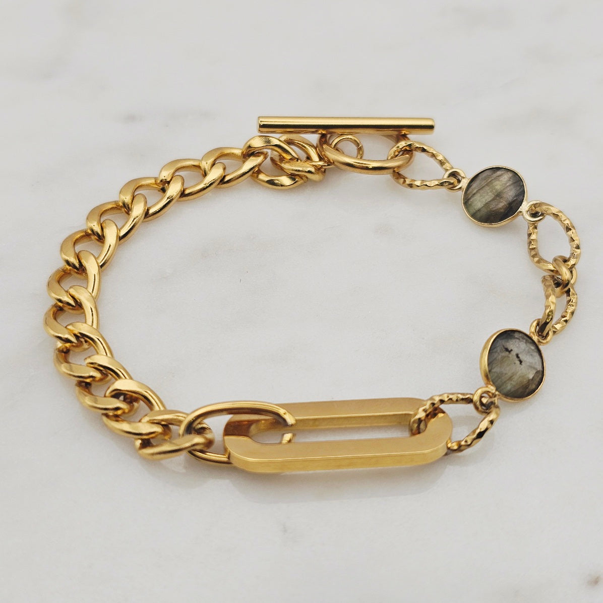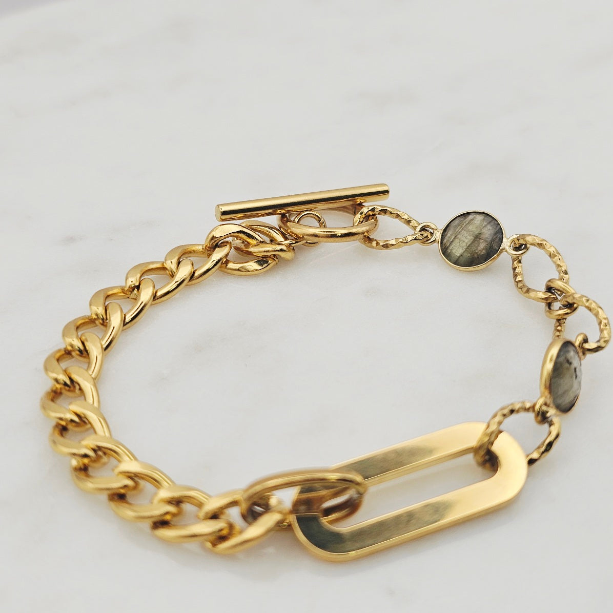 18kt gold stainless steel linked chain with labradorite or moonstone gemstones. Toggle closure and oblong pendant.