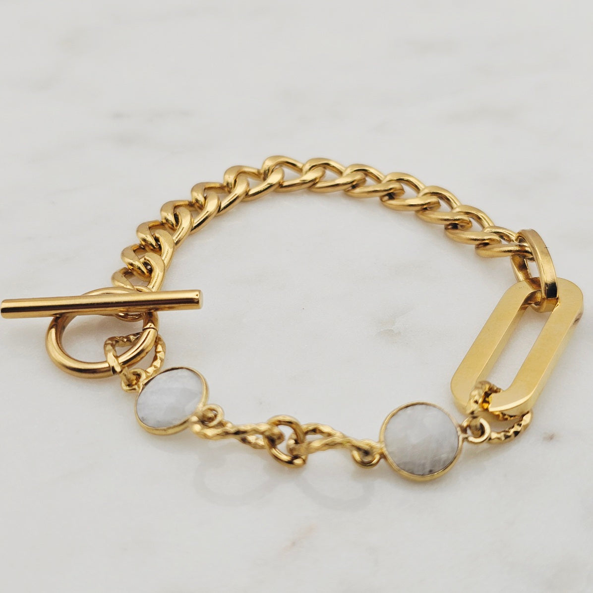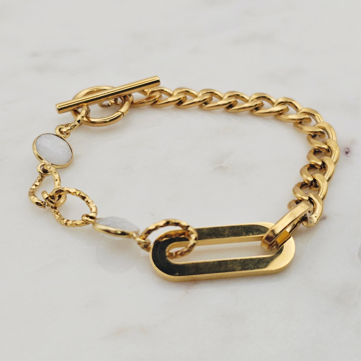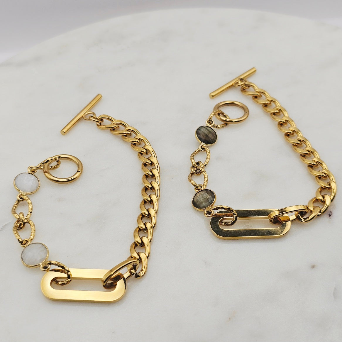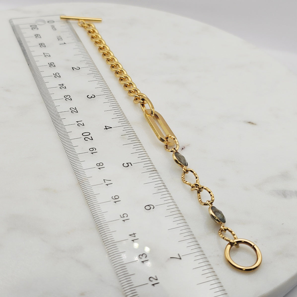 18kt gold stainless steel linked chain with labradorite or moonstone gemstones. Toggle closure and oblong pendant.