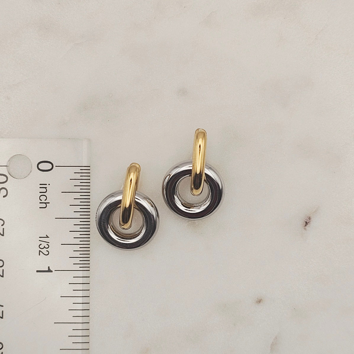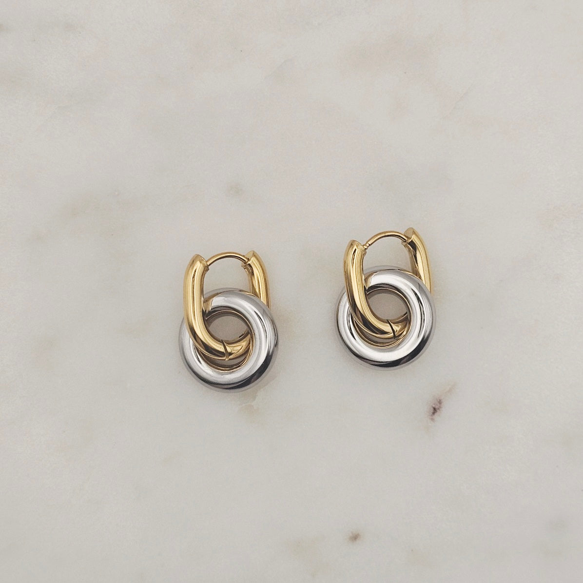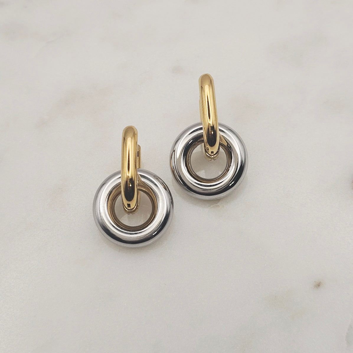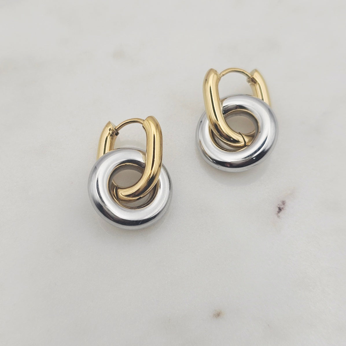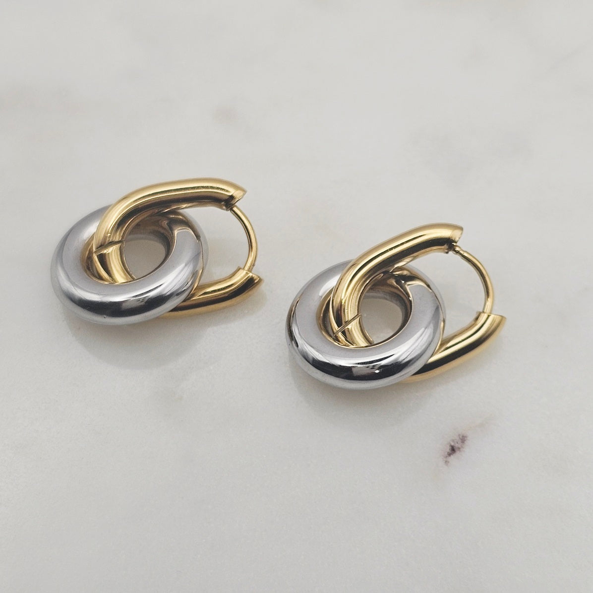 18kt gold plated, stainless steel, two tone, huggie style earrings. Chunky trending style that's very unique, casual yet elegant and elevated. Great to wear from day to evening.