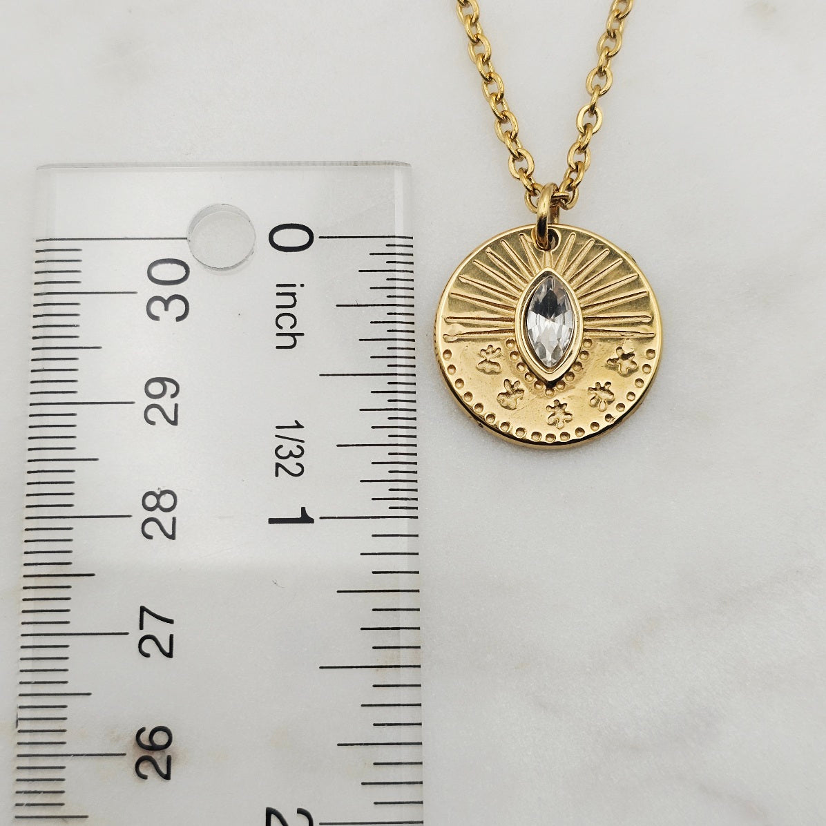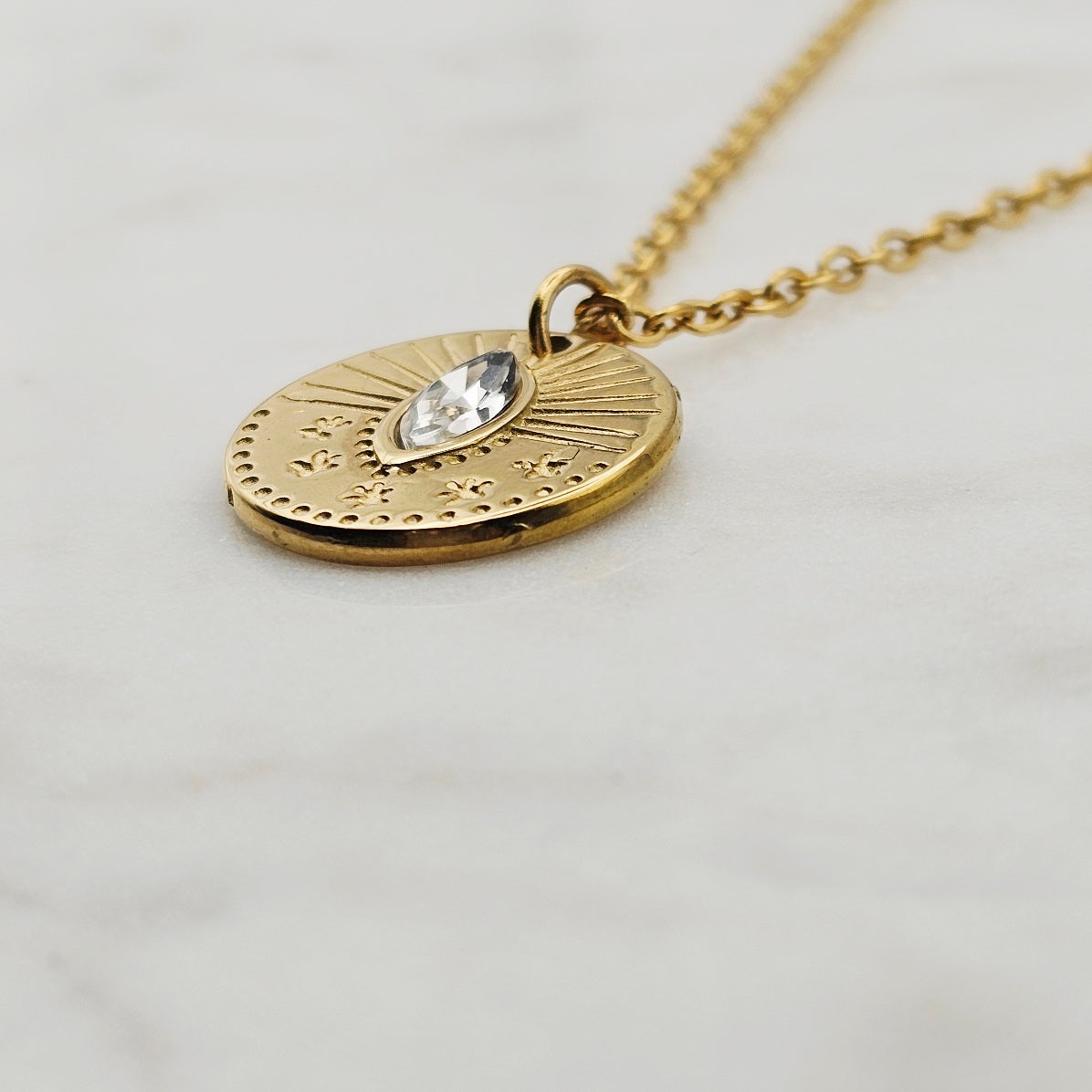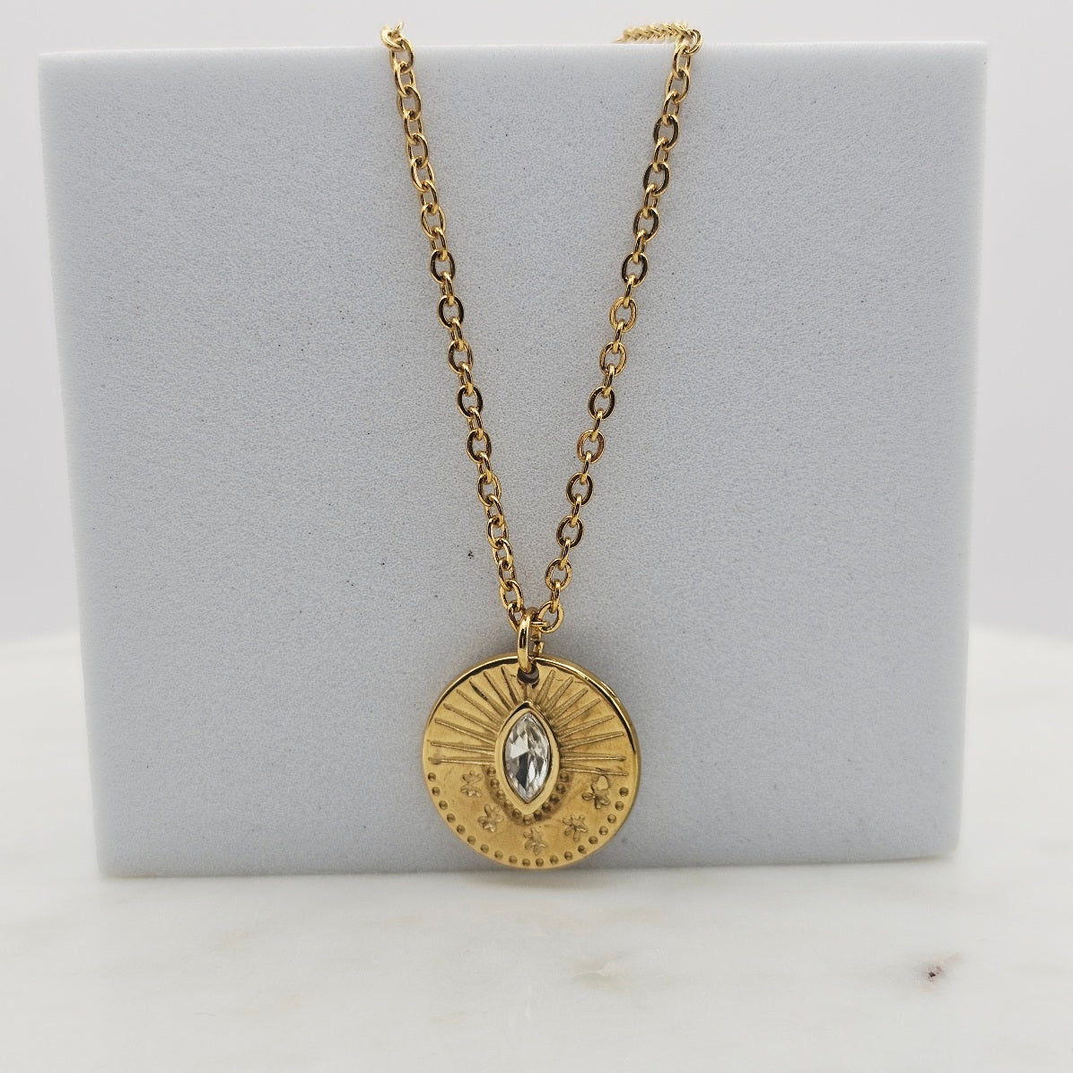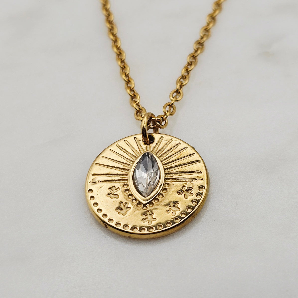Clear cz stone with burst indentions medallion pendant necklace. 18kt gold plated, non-tarnish, and waterproof. Great to layer with complimenting necklaces.