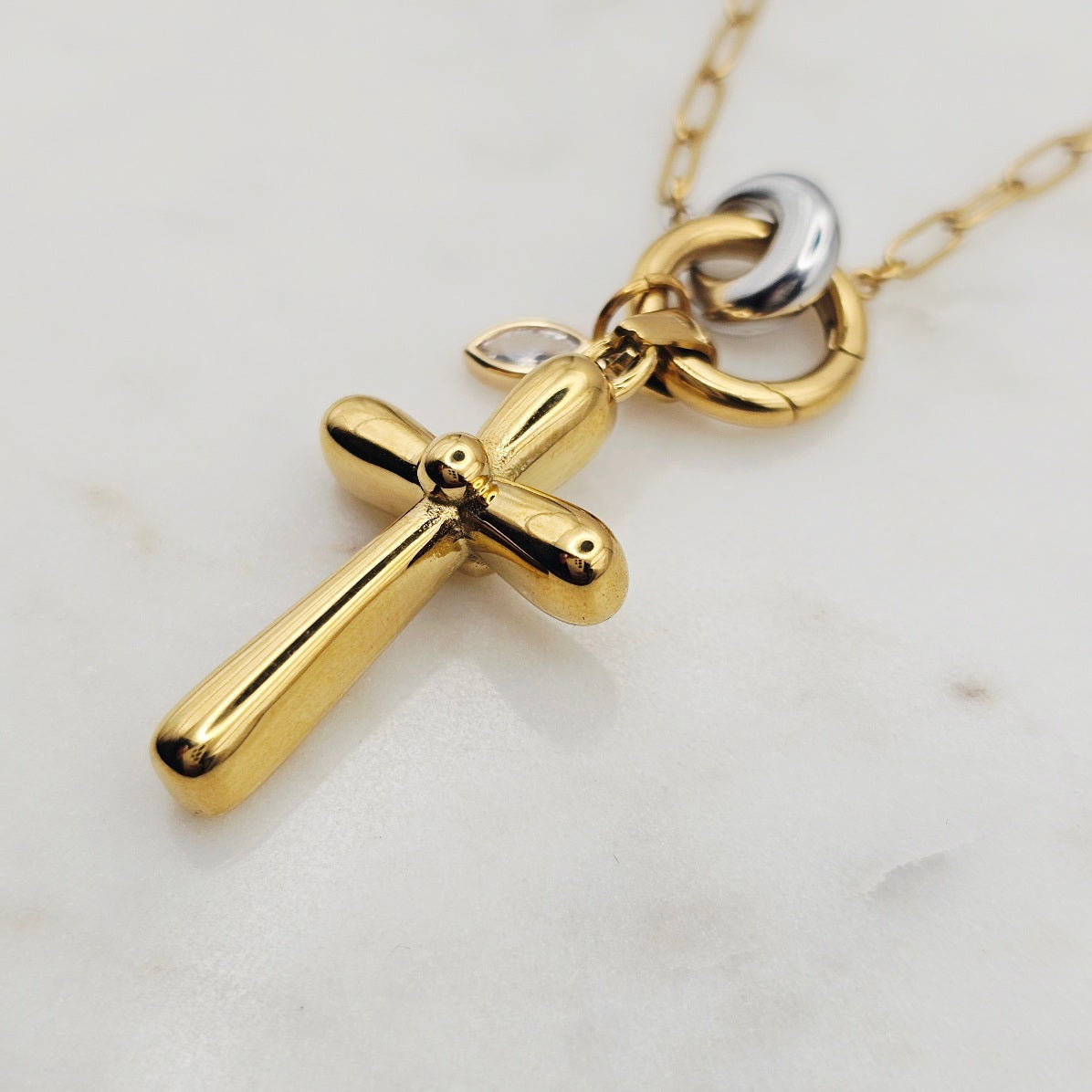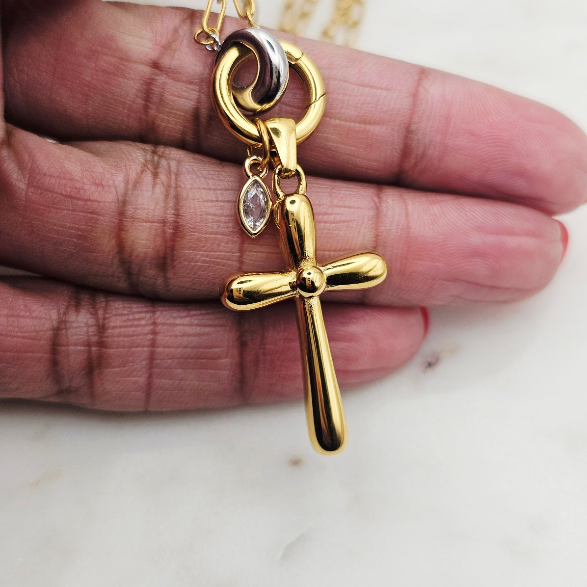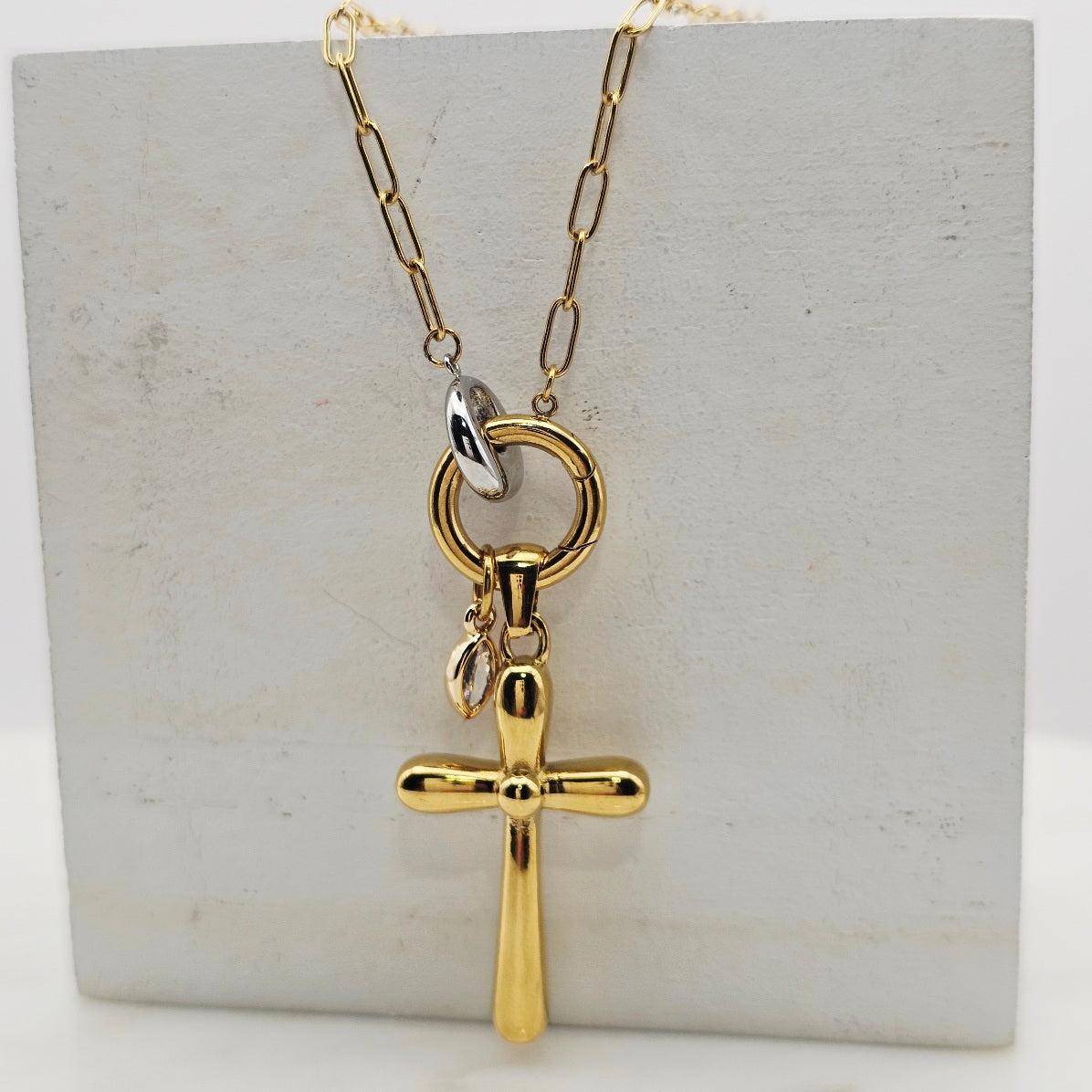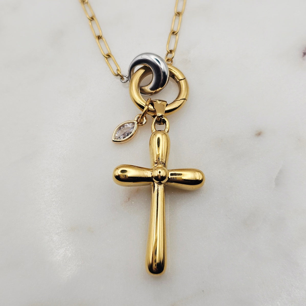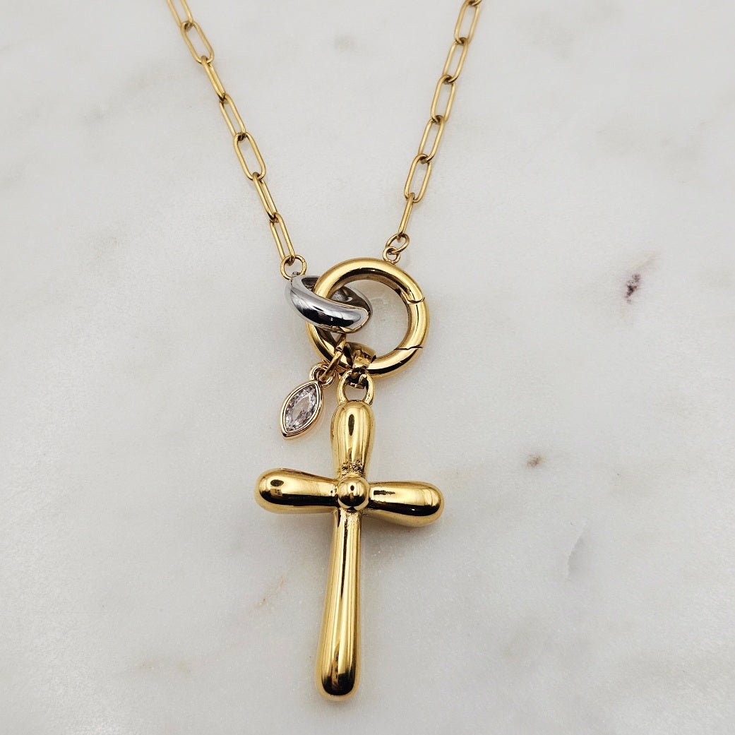 18kt gold stainless steel necklace. Thick cross pendant with a clear cz crystal on a paperclip chain.  Very uniquely shaped cross pendant. Very versatile and can be great for layering with other complimenting necklaces. Non-tarnish and waterproof.