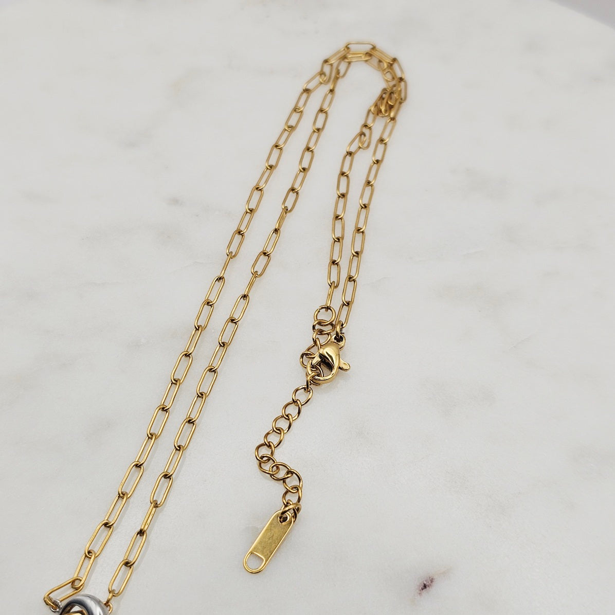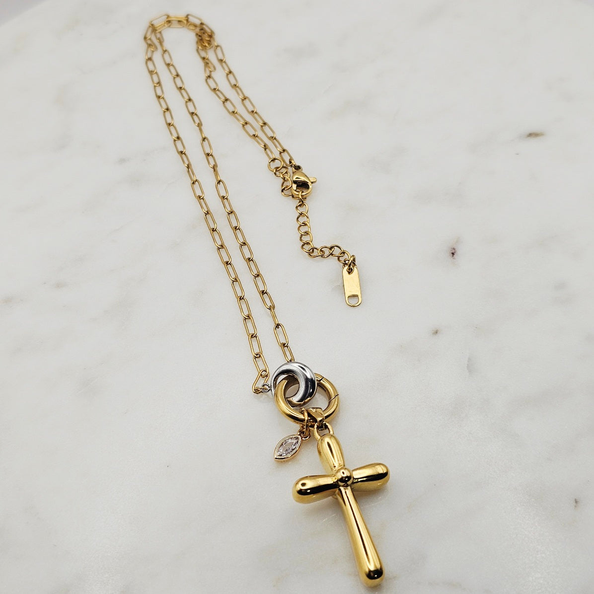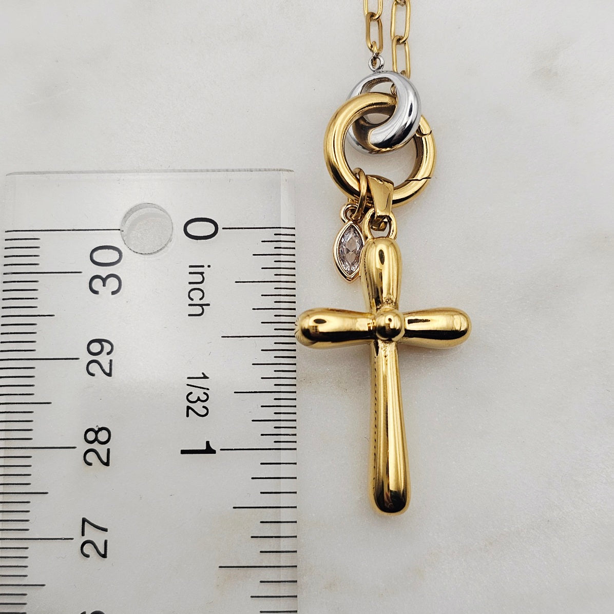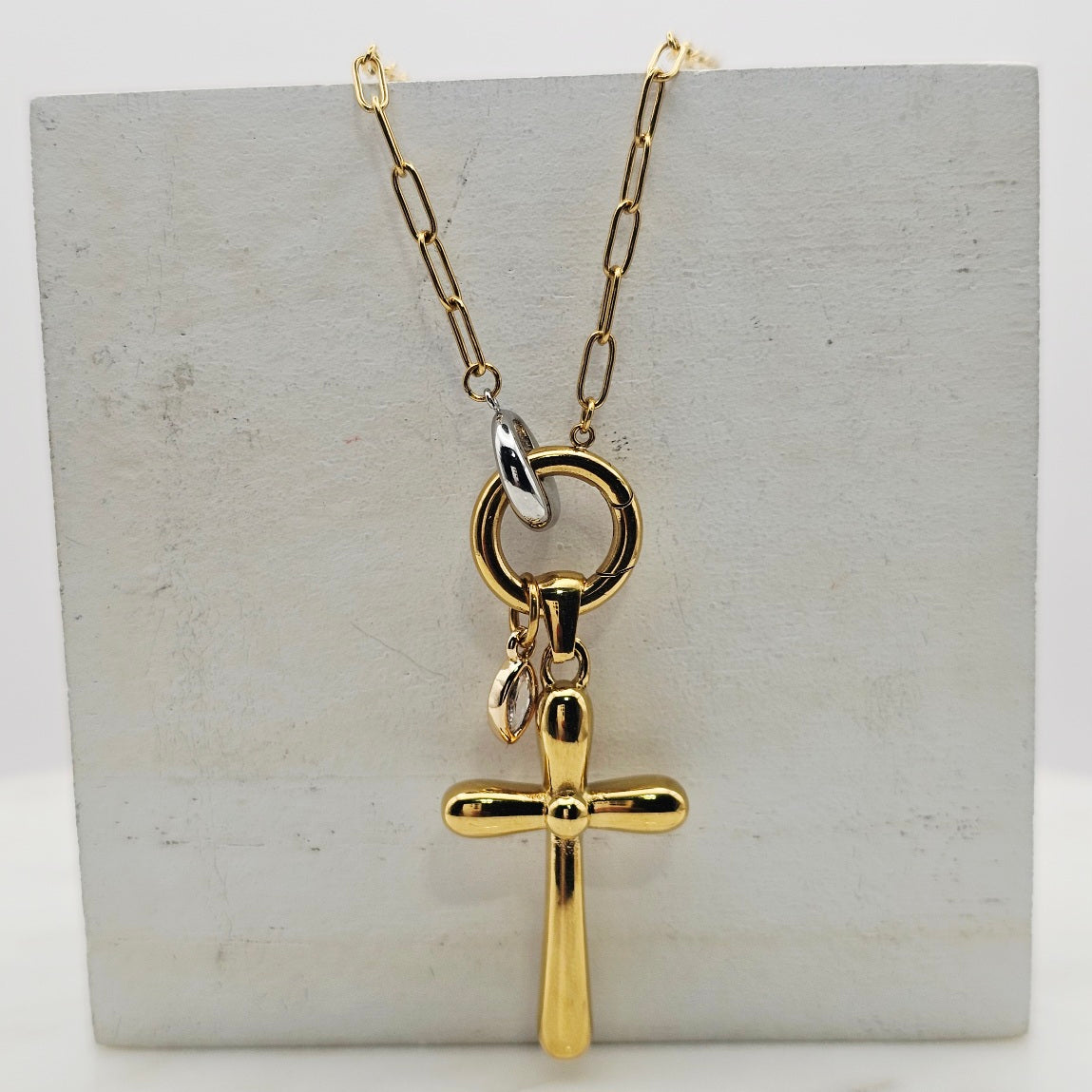 18kt gold stainless steel necklace. Thick cross pendant with a clear cz crystal on a paperclip chain.  Very uniquely shaped cross pendant. Very versatile and can be great for layering with other complimenting necklaces. Non-tarnish and waterproof.
