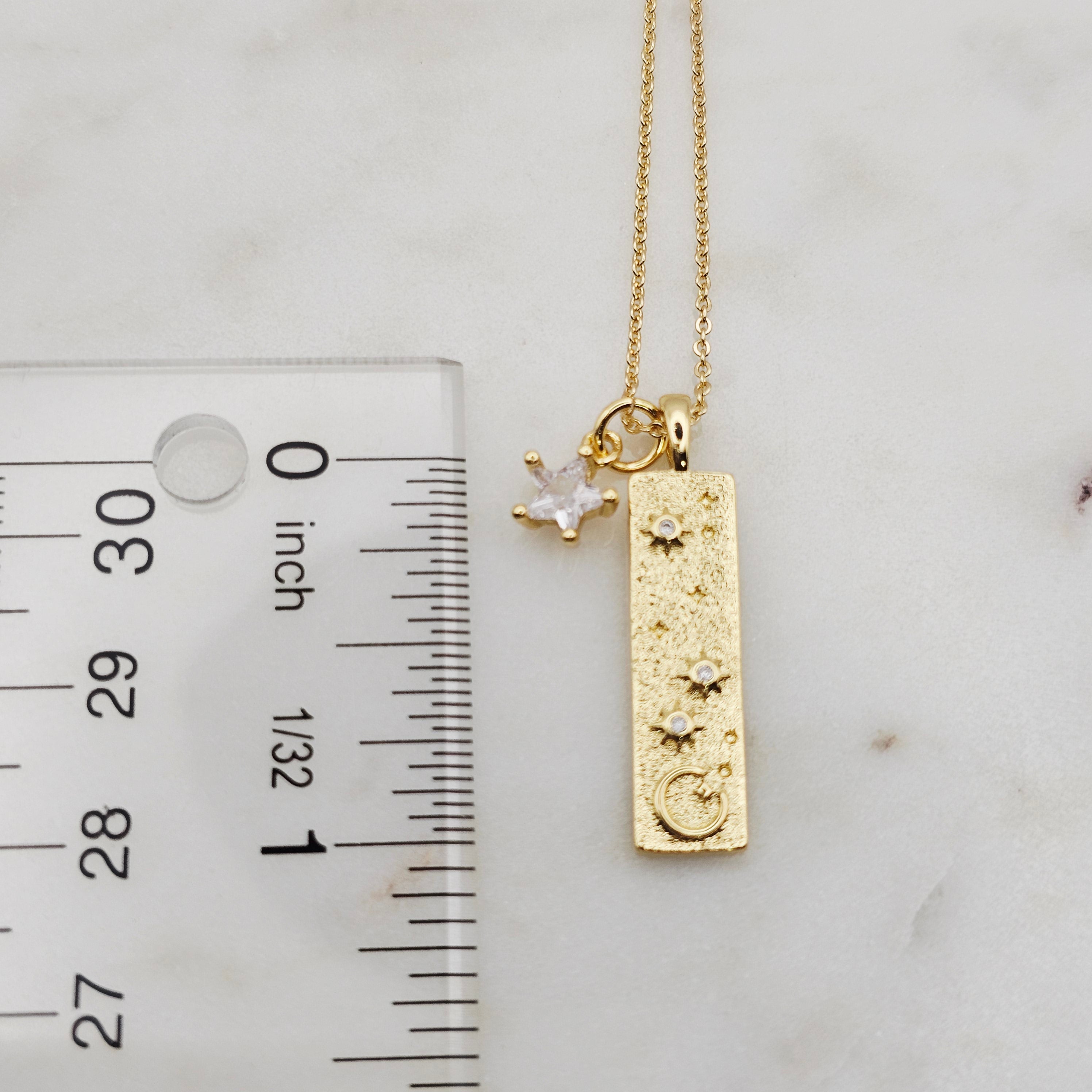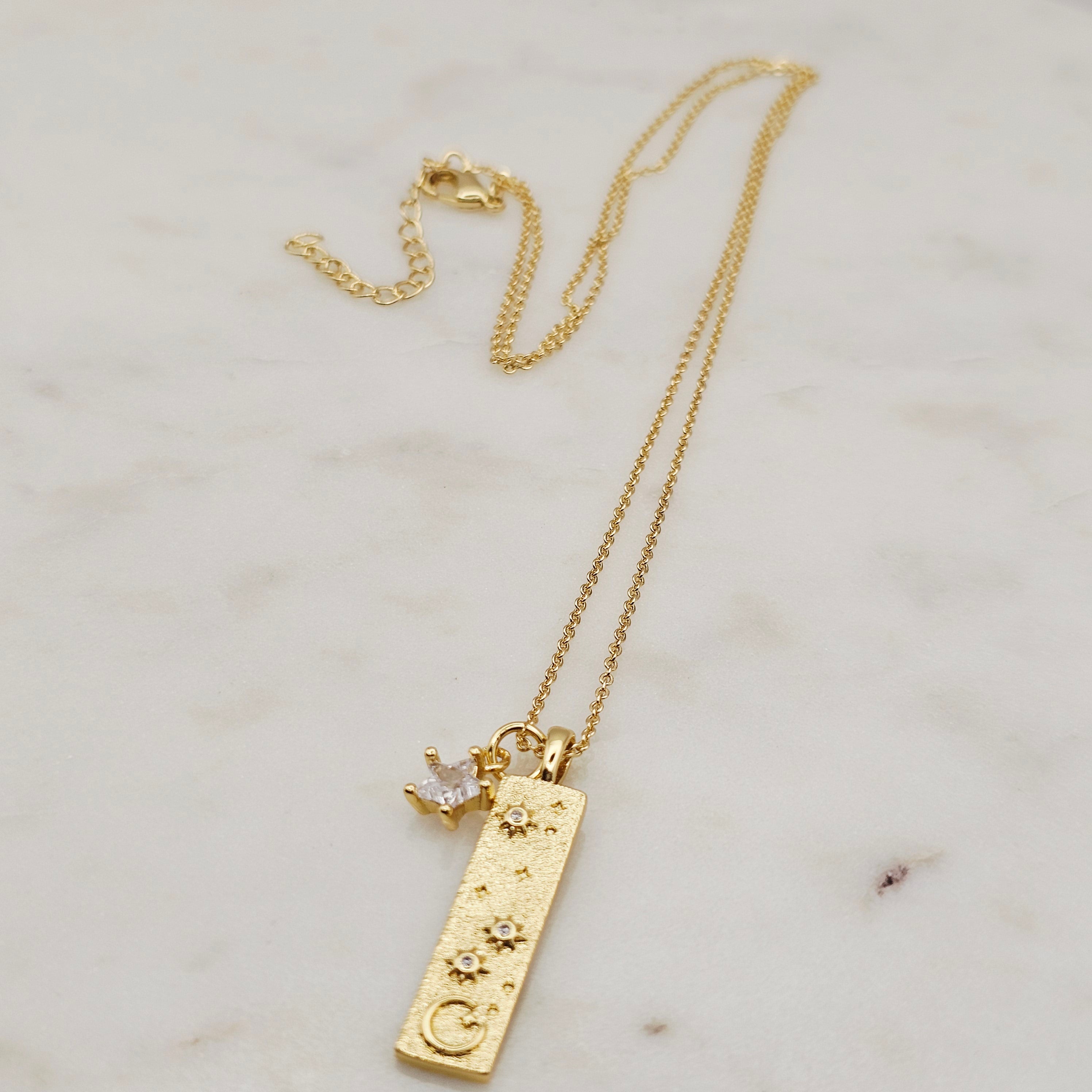14kt gold filled multi charms celestial pendant necklace. A gold bar with small cz star. Great for layering with other complimenting necklaces. Non-tarnish and waterproof.