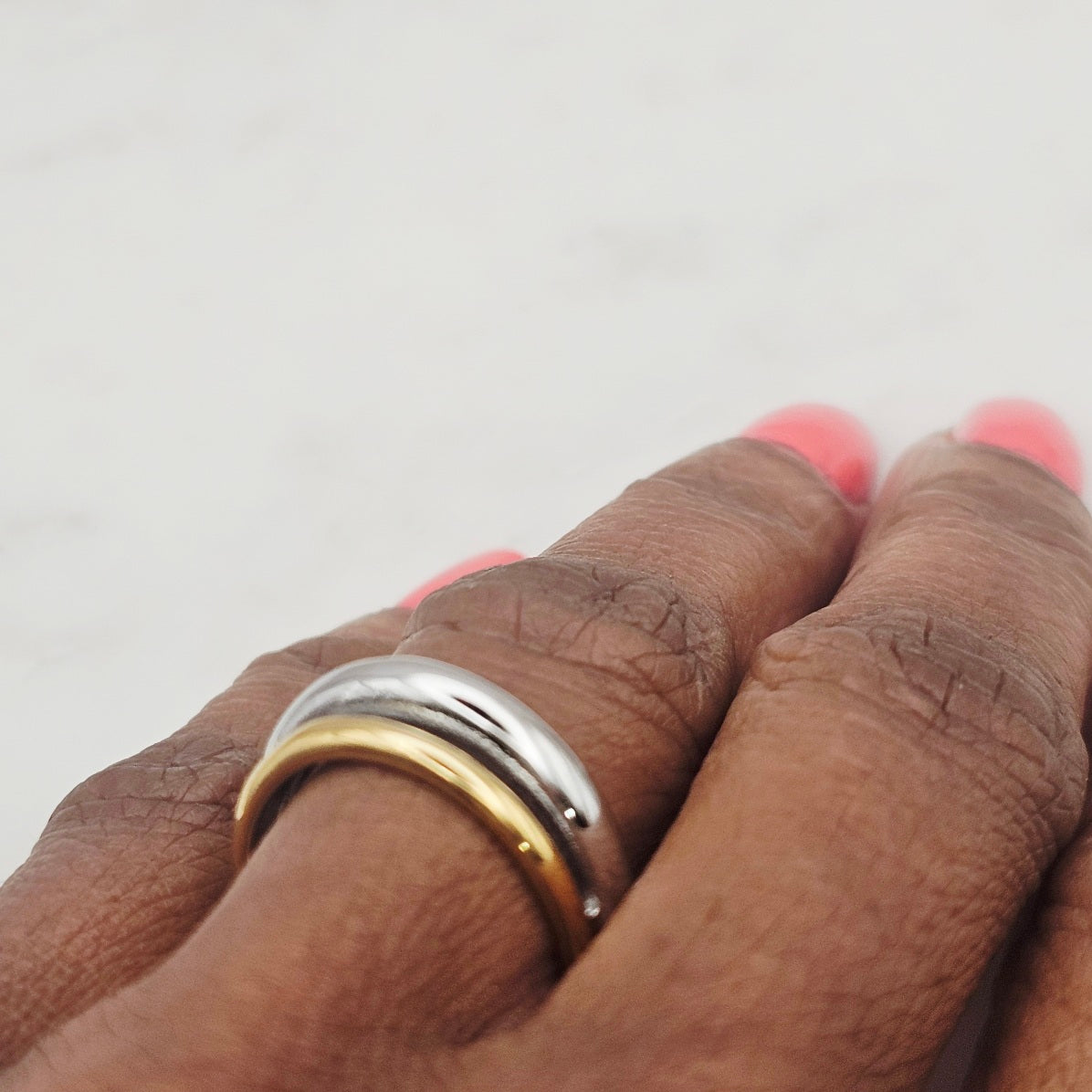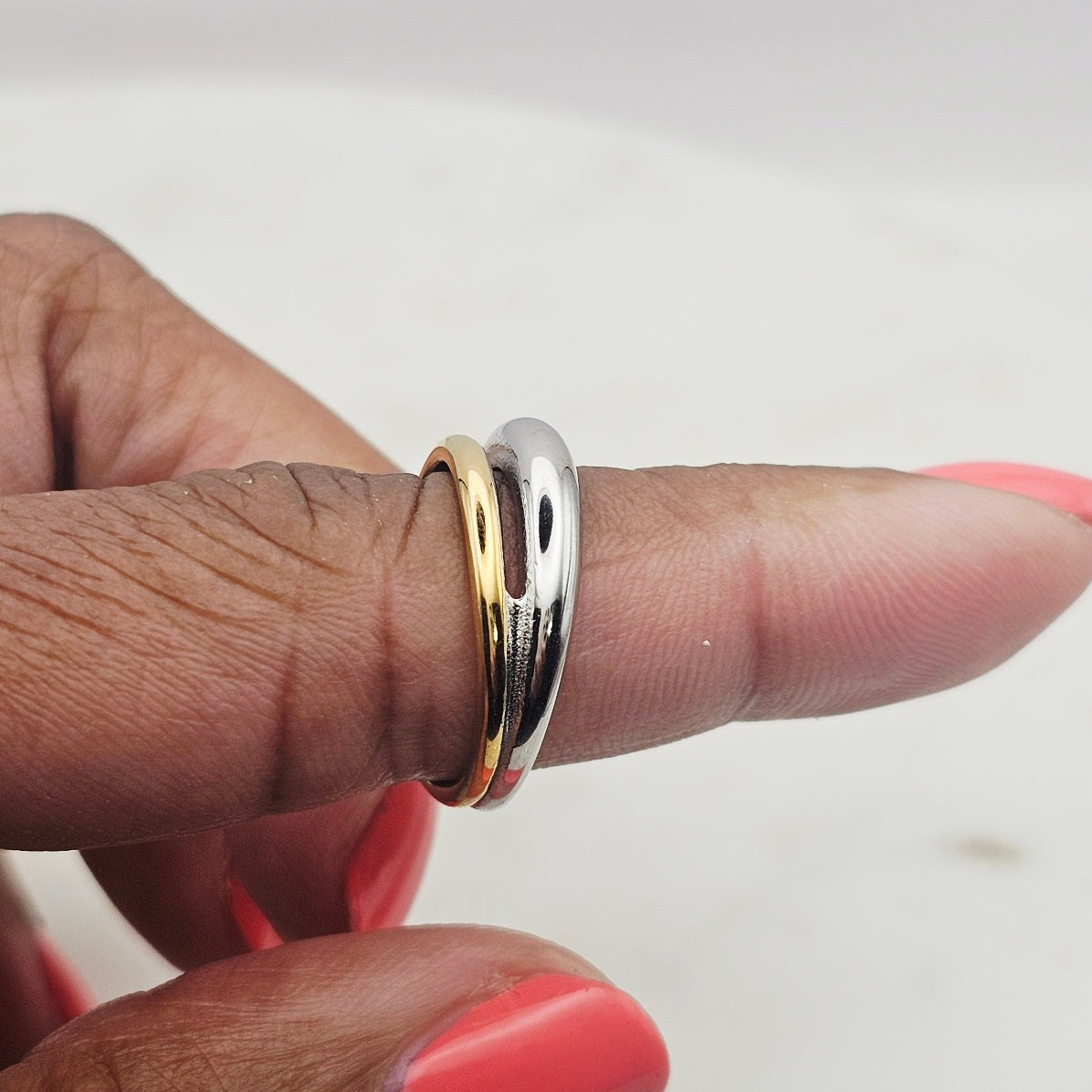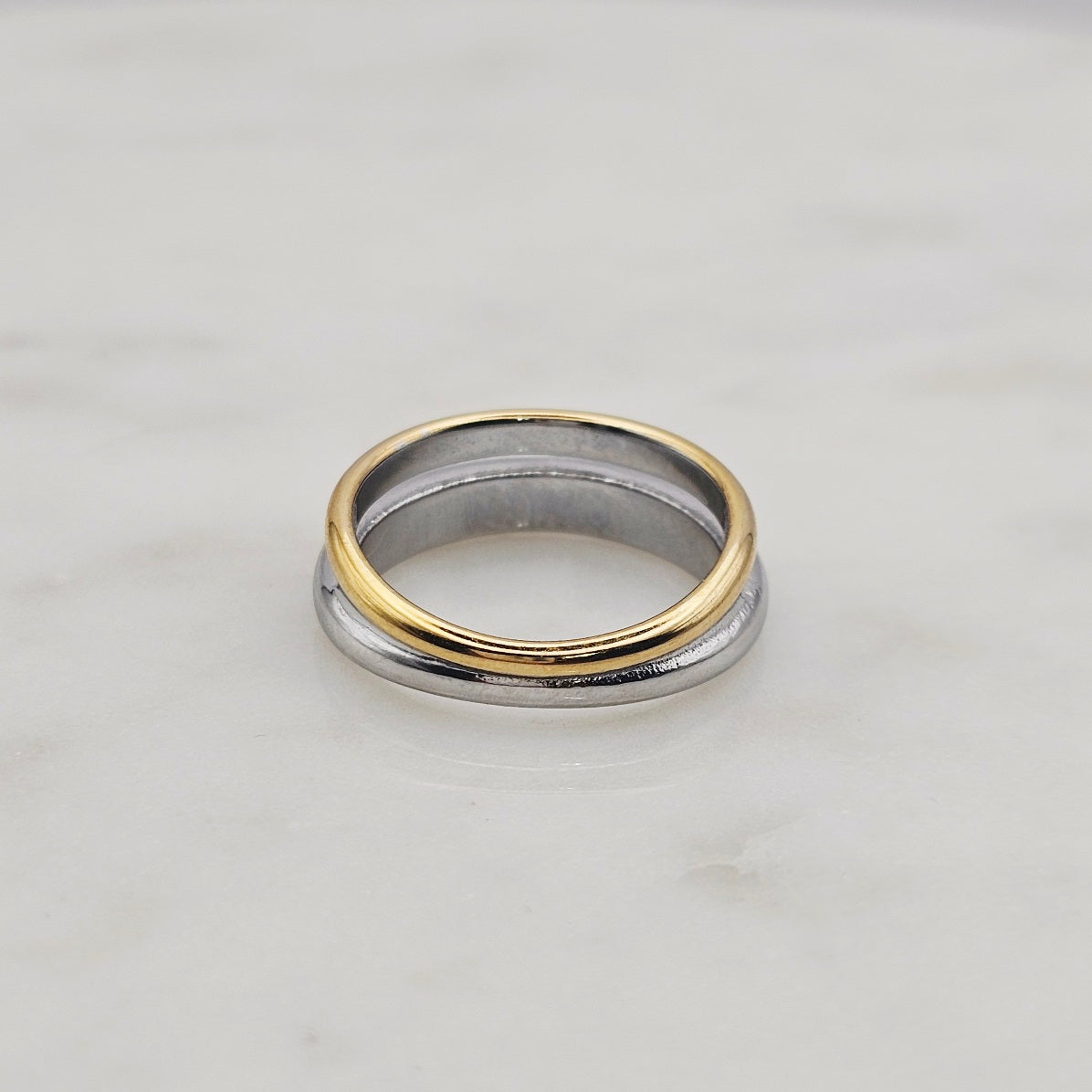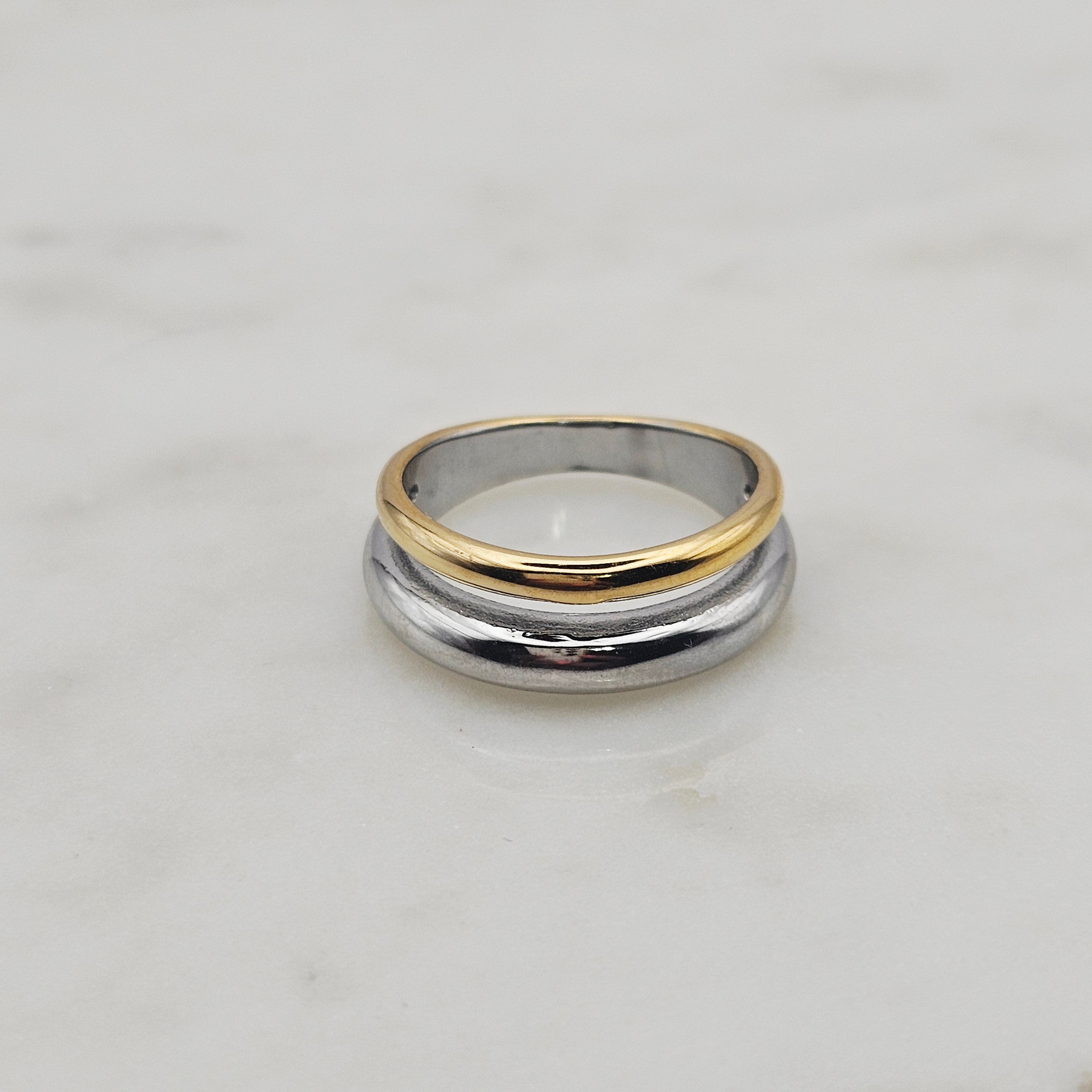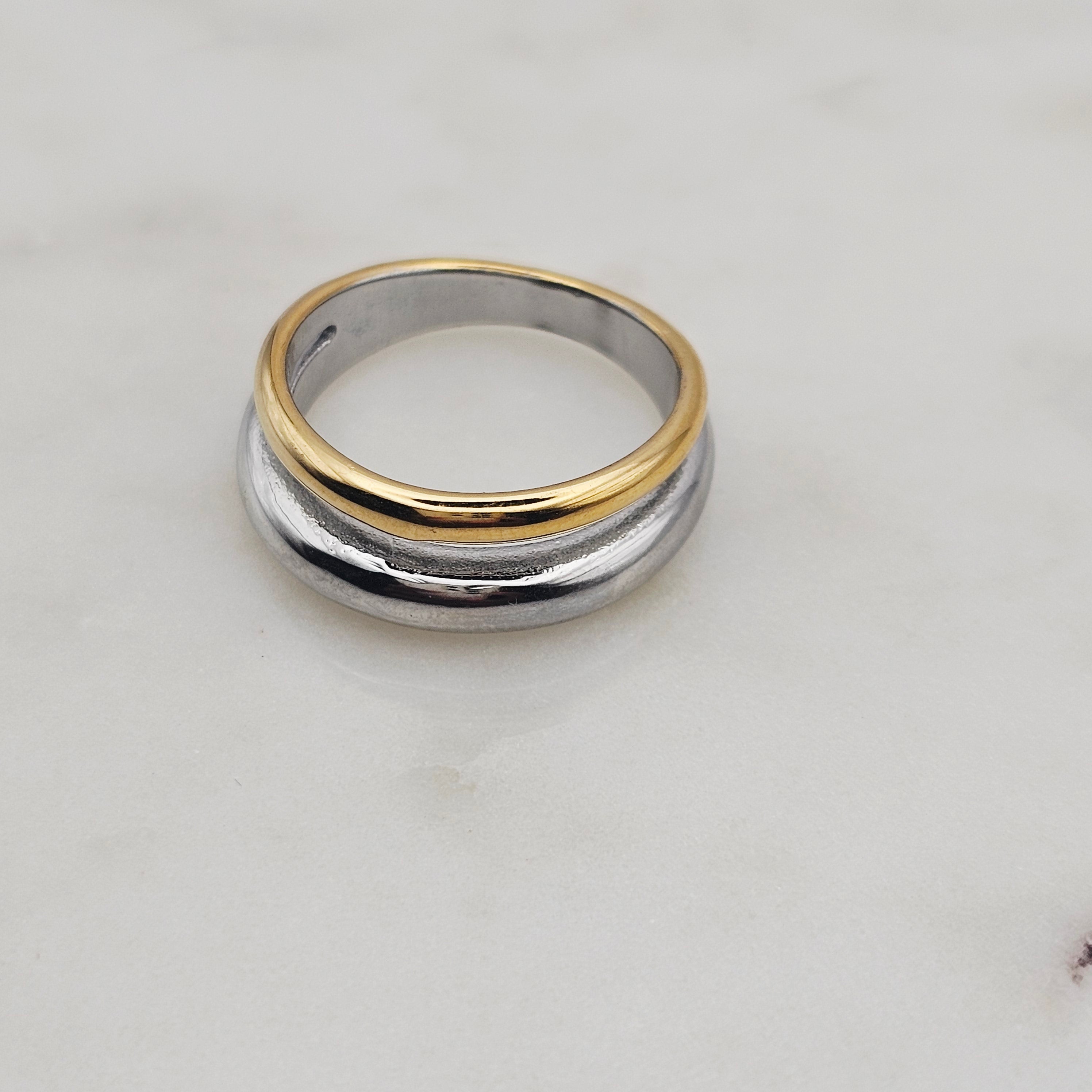 18kt gold stainless steel and shiny stainless steel, band ring. The design has a gold band and a silver band meshed into one ring style. This ring makes a fashion statement yet is elegant, stylish, and unique. Great to wear with complimenting rings, permanent jewelry, bangles and other rings. Non-tarnish and waterproof.