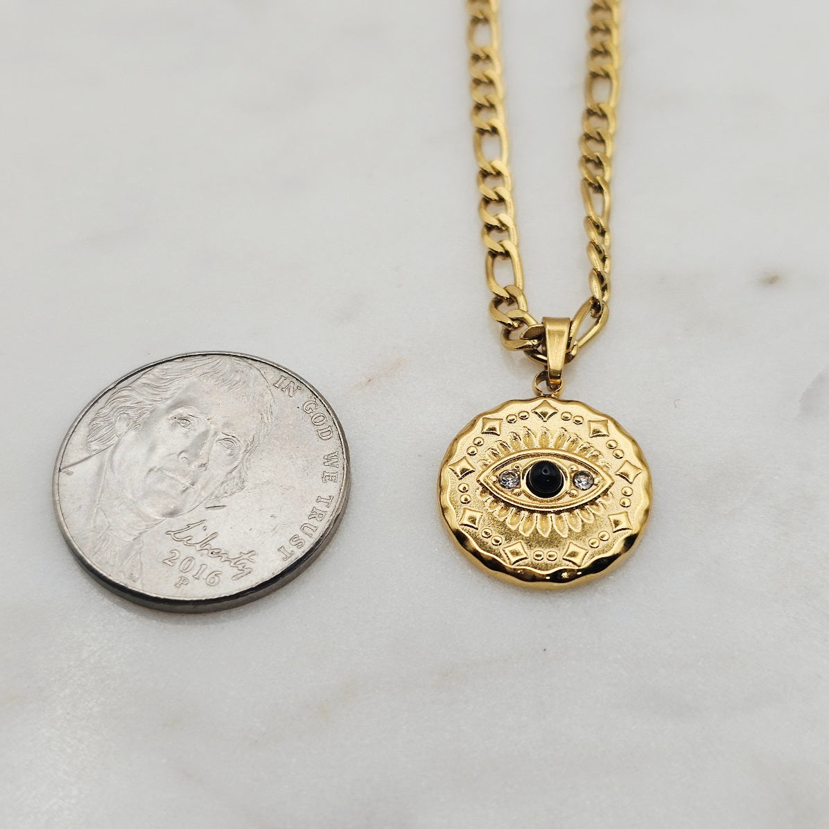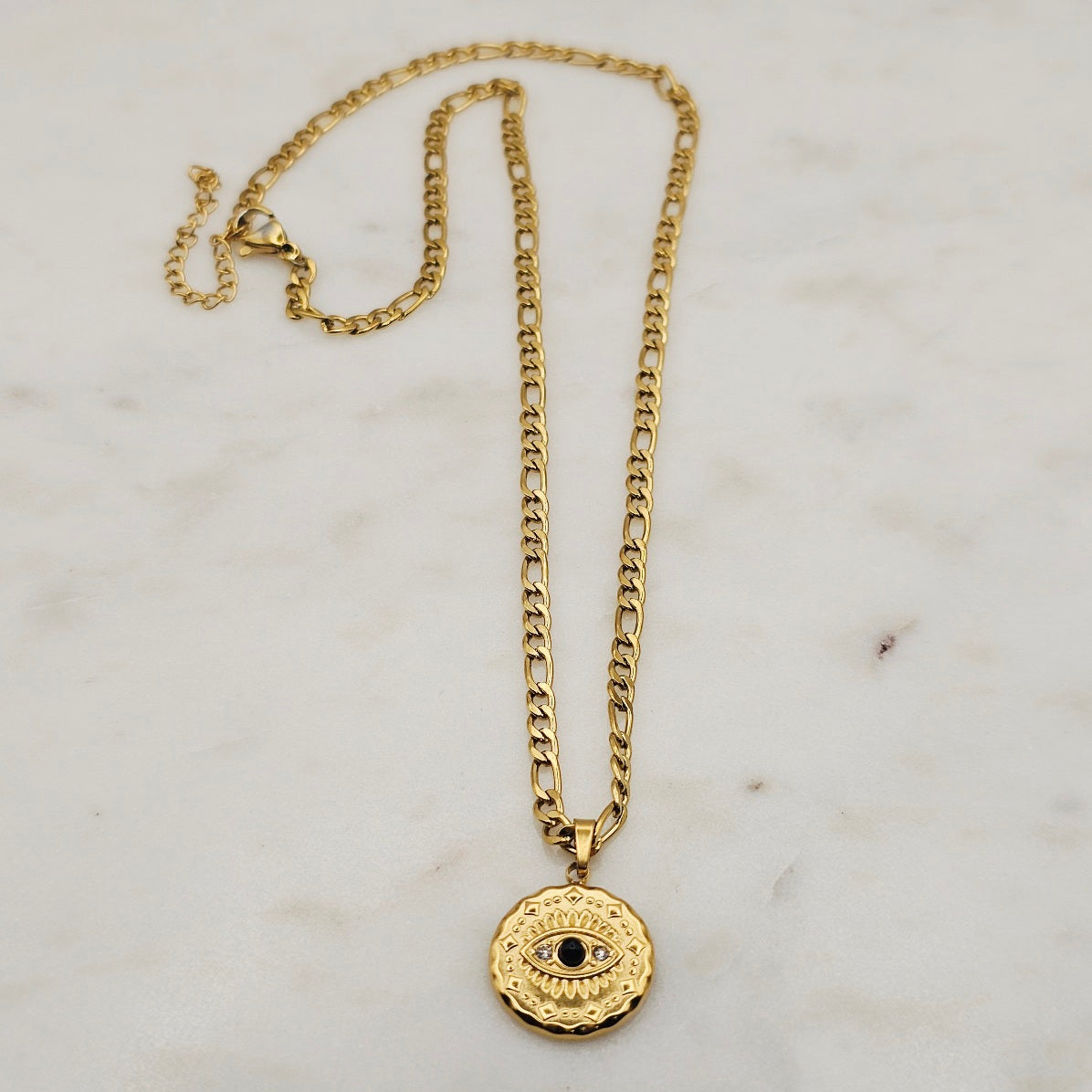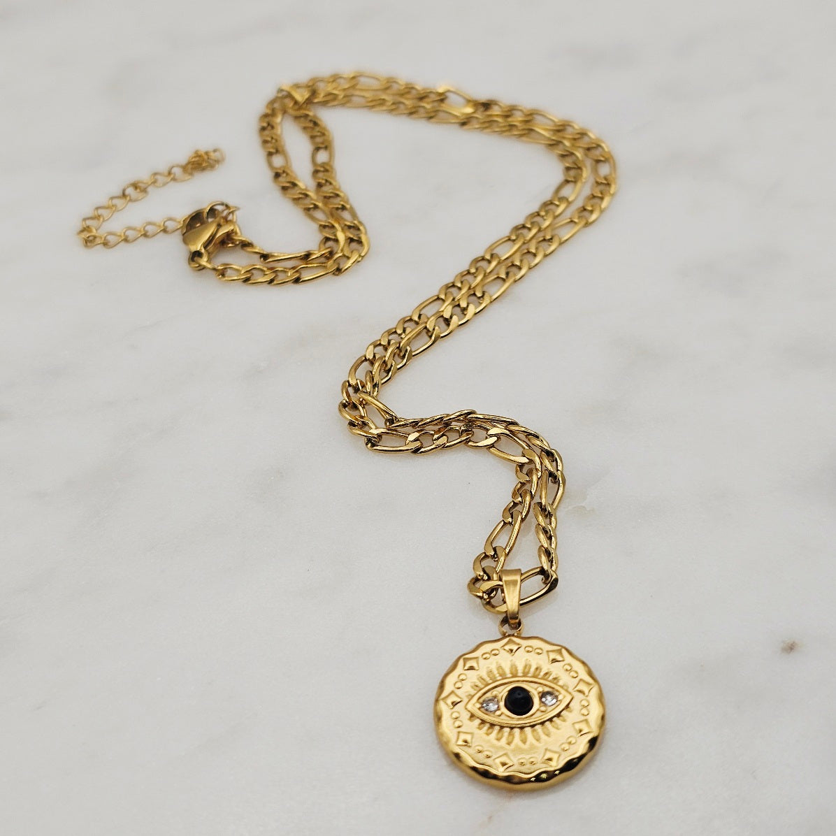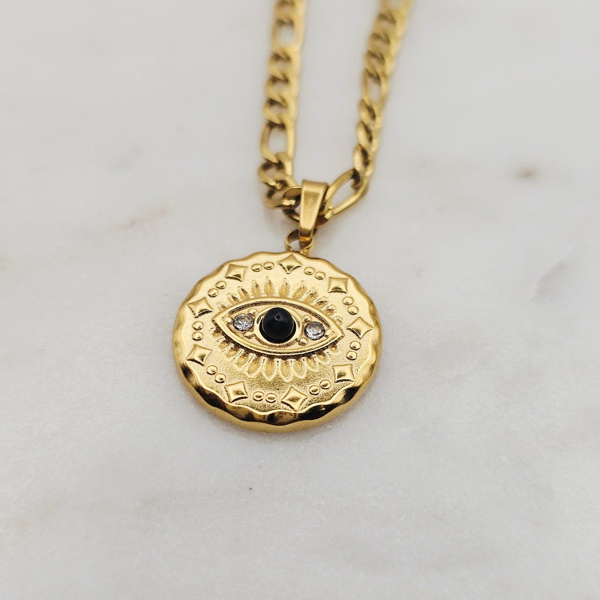 Third eye pendant necklace with a tiny black onyx gemstone and cz stones. 18kt gold plated, non-tarnish, and waterproof. Great to layer with complimenting necklaces.
