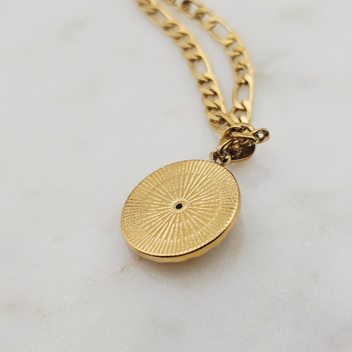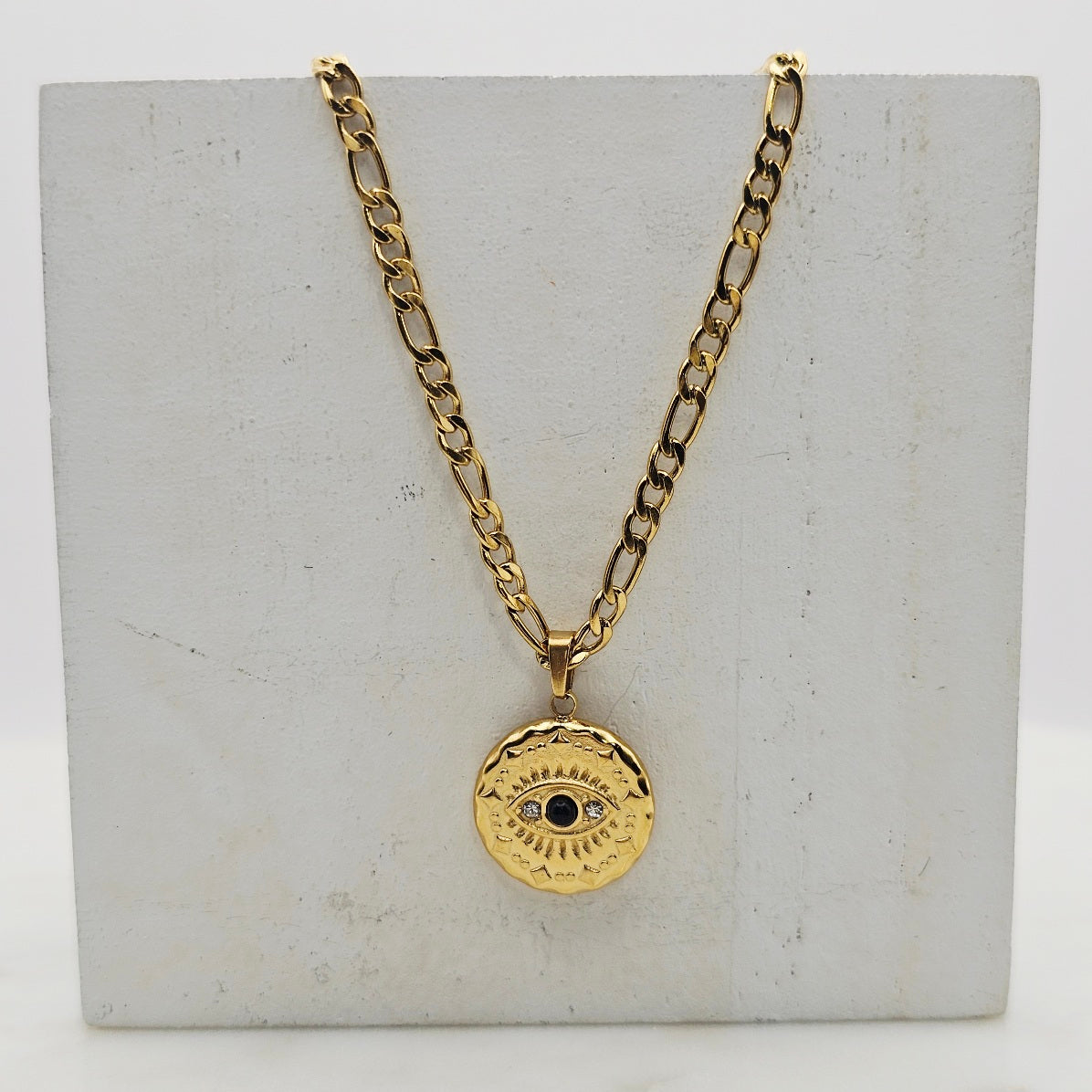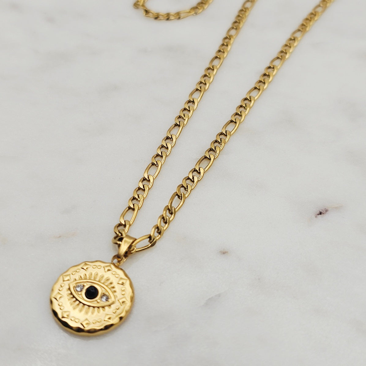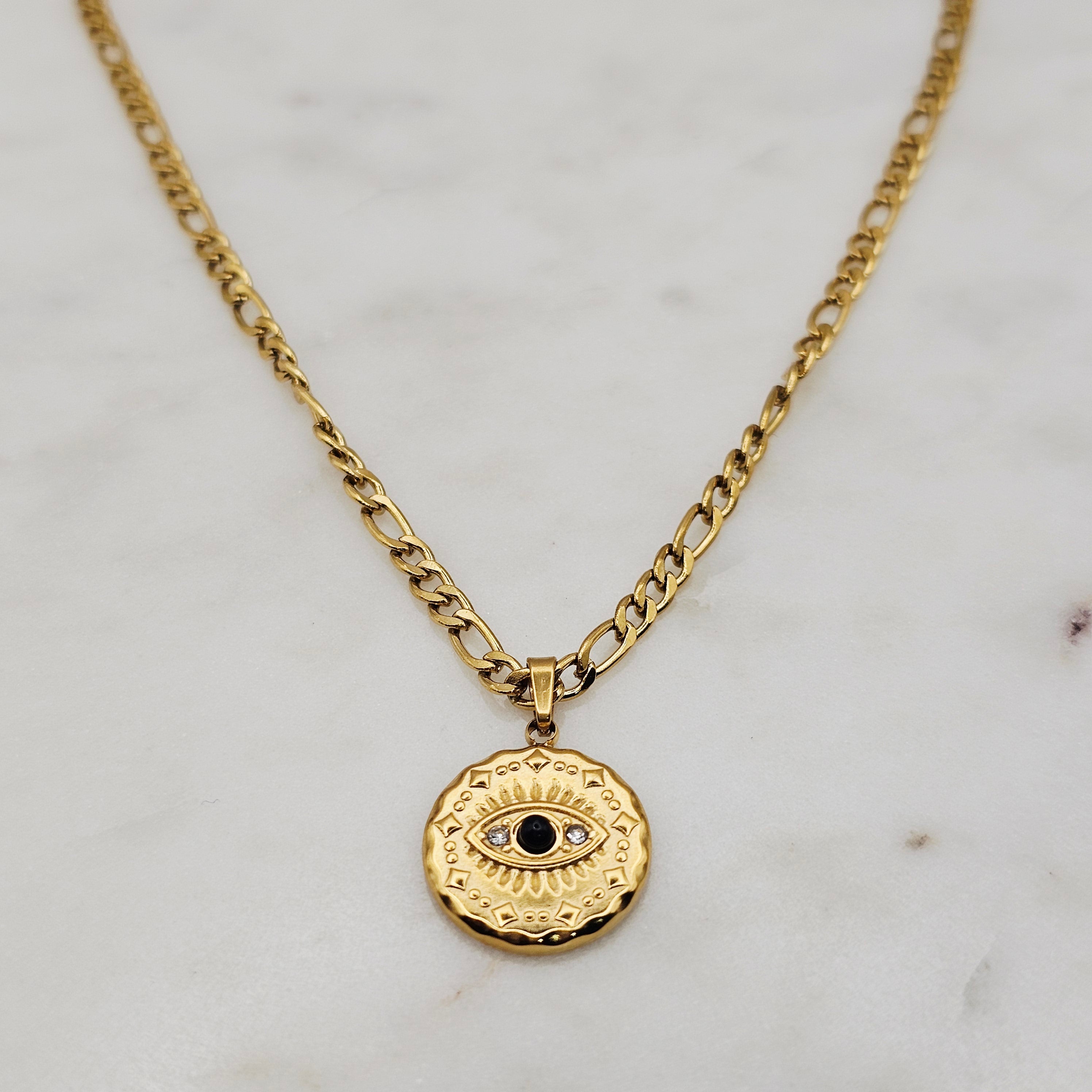 Third eye pendant necklace with a tiny black onyx gemstone and cz stones. 18kt gold plated, non-tarnish, and waterproof. Great to layer with complimenting necklaces.